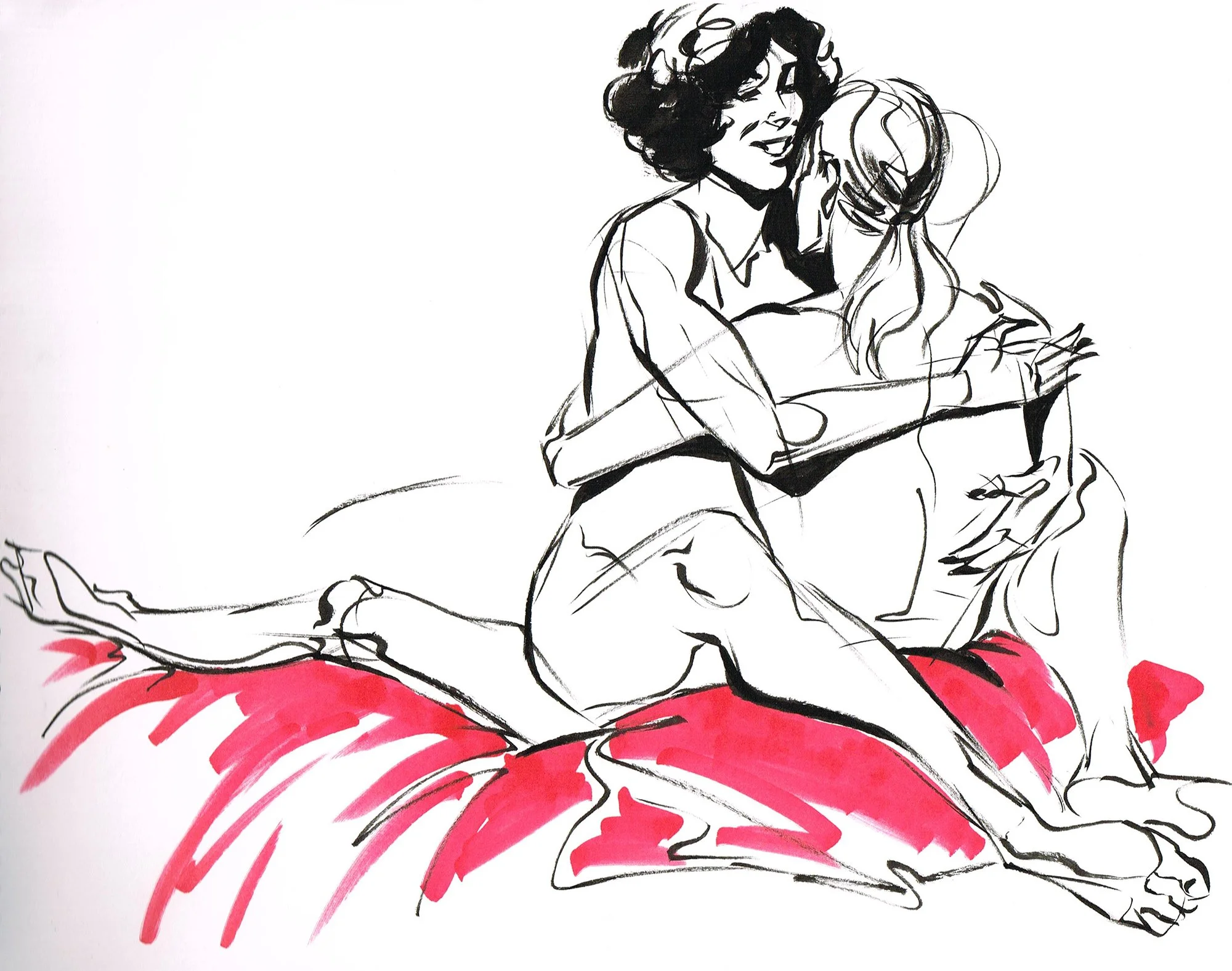 Modeled by Angi and Jim at a private party. Pentel pocket brush pen and R29 Lipstick Red Copic marker on 80lb vellum sketchbook paper.